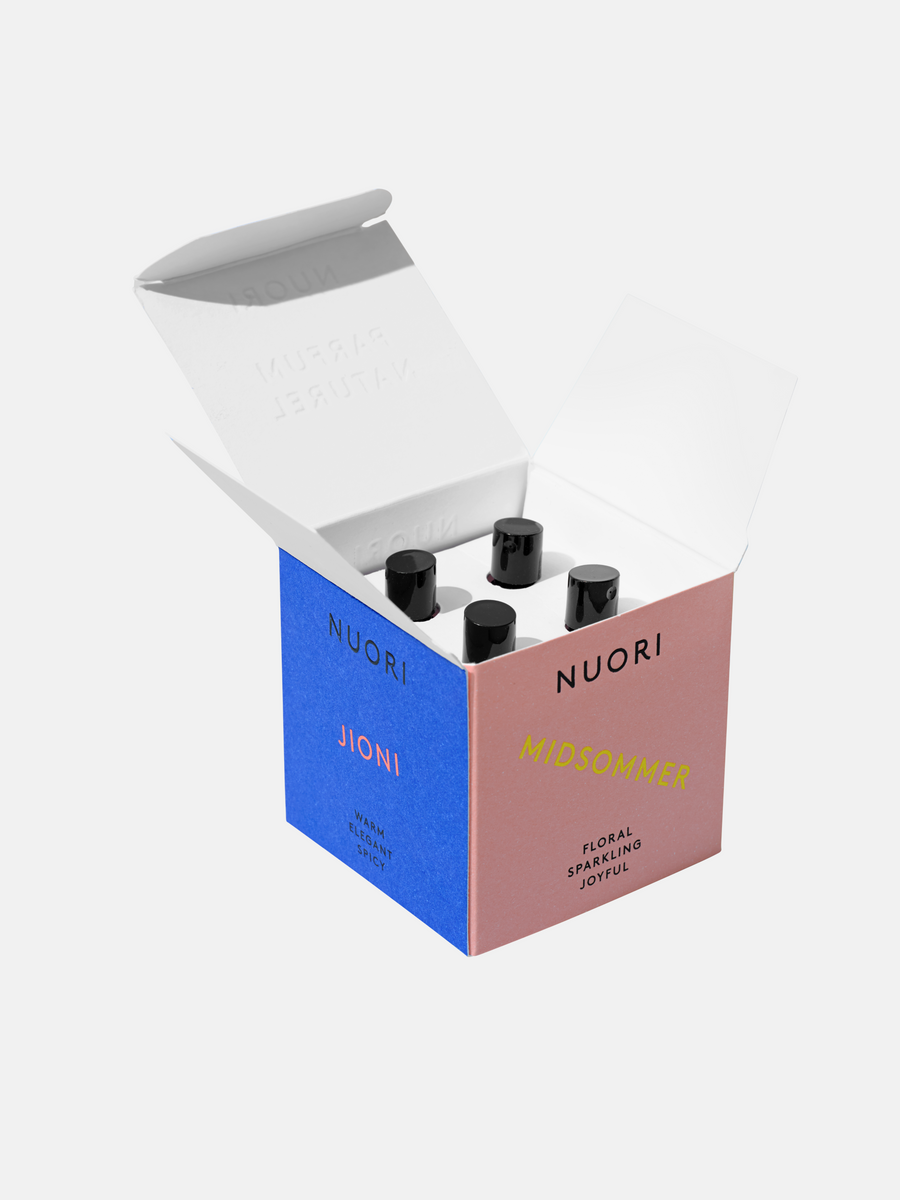 Explore NUORI’s debut collection of natural fine fragrances with this set of 4 x 2ml Eau de Parfum samples. Each scent offers a unique experience: MIDSOMMER – Floral and joyful, SHINRIN – Green and woody, BIENNALE – Fresh and aromatic, and JIONI – Warm and elegant. A perfect introduction to NUORI’s refined fragrances.